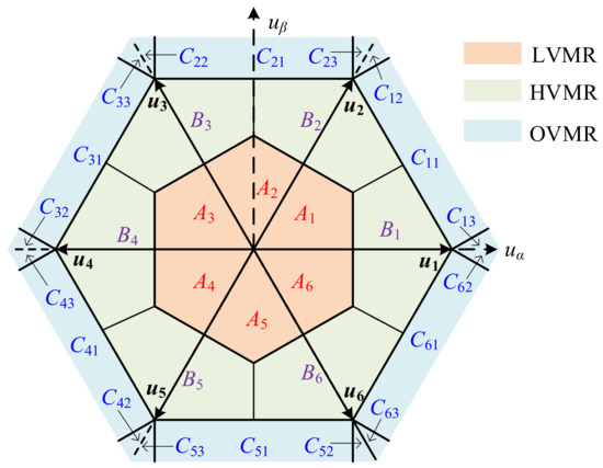 The division of three regions (LVMR, HVMR, and OVMR) is shown in Figure 5, and each region is further divided into several parts, where u1, u2, u3, u4, u5, and u6 represent the six basic AVVs. According to the linear modulation range and geometric analysis, the two specific boundary equations are derived as