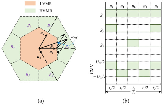 The diagram of NSPWM: (a) Zone division of HVMR; (b) Switching signal and CMV when uref is in B1.