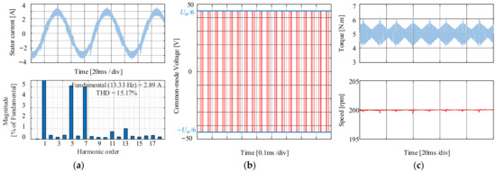 Similarly, Figure 11 shows the steady-state performance for SVPWM in LVMR. It has great speed stability, low torque ripple, and low current ripple. However, utilizing ZVV in the modulation process causes a high CMV amplitude, which is Udc/2, as shown in Figure 11b.