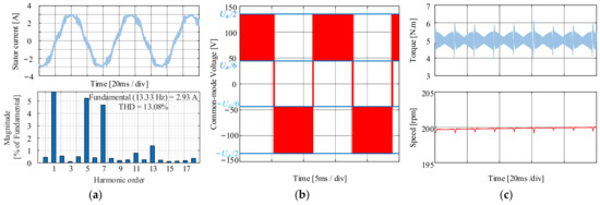 Steady-state simulation results for NSPWM when PMSM at 200 rpm with the load of 5 N·m. (a) Current and FFT analysis. (b) CMV. (c) Torque and speed.