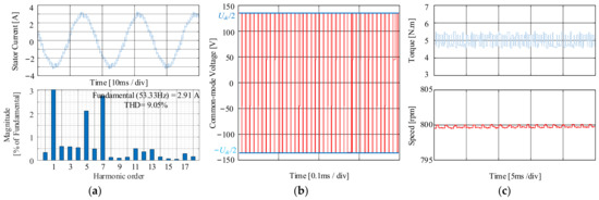 Steady-state simulation results for SVPWM when PMSM at 800 rpm with the load of 5 N·m. (a) Current and FFT analysis. (b) CMV. (c) Torque and speed.