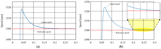 Second, to test the steady-state improvement of IOMPWM set the DC-link voltage to the original value and controlled speed to 1500 rpm. It focuses on the process after the speed overshoot. In Figure 16, the red lines represent the controlled speed reference value, and the blue lines represent the PMSM speed. The PMSM controlled by IOMPWM reaches and remains at the targeted speed at 0.2 s. However, the PMSM controlled by the conventional method has a bigger overshoot speed and also cannot reach the target speed even at 0.3 s.