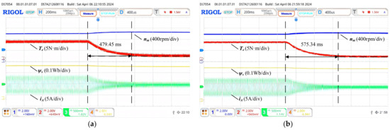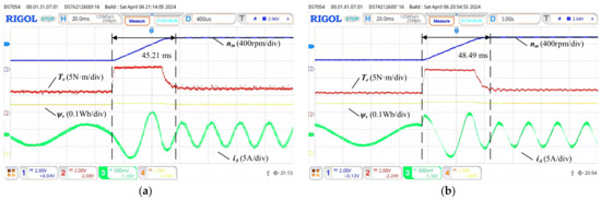 Dynamic response experimental results at 1000 rpm decrease from 5 N·m to 0 N·m. (a) The proposed method. (b) SVPWM.