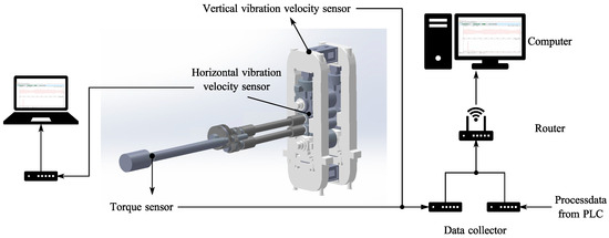 The installation of the measuring points is shown in Figure 1. The vibration speed sensor on the top of the mill is used to detect the vertical vibration of the mill, the horizontal vibration of the work roll can be approximated with the sensor on the bearing seat and the torque tester on the drive shaft can detect the rolling torque. After data collection, subsequent data analysis is carried out through calculation. Other rolling process parameters can be obtained from the PLC.