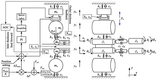 The mill vibration problem has troubled the steel industry for decades and its occurrence is often accompanied by a variety of rolling process conditions. Violent vibration negatively impacts the mill itself and the surface quality of the strip. Some scholars believe that mill vibration is the loss of stability caused by negative system damping. Yarita et al. [1] first made a theoretical analysis of this view. Tlusty et al. [2] attributed the negative damping to the tension fluctuation of the strip. Yun et al. [3,4,5] analyzed the negative damping mechanism of modal coupling and regenerative vibration. Gao et al. [6] studied the critical rolling speed under the negative damping mechanism. Heidari et al. [7] optimized the process parameters of rolling and improved the rolling speed limited by flutter. Some scholars believe that there are coupling mechanisms in the rolling mill vibration. Zheng et al. [8] considered that the mill vibration included multimode coupling such as vertical, horizontal, axial and torsional vibrations. Wang et al. [9] used the harmonic response method of ANSYS to study the amplitude-frequency characteristics of the vertical-torsion coupling system. Jia et al. [10] studied the effect of dynamic stiffness compensation on the electromechanical coupling vibration of a rolling mill. Cui et al. [11] studied the rigid–flexible coupling problem between rolling mill and strip vibration. The mill vibration will appear as nonlinear behavior, so some scholars focus on the study of mill nonlinear vibration. Peng et al. [12] analyzed the vibration characteristics of a hot rolling mill with elastoplastic hysteresis deformation. Liu et al. [13] analyzed the influence of time-varying bearing stiffness on rolling mill vibration. Zeng et al. [14] analyzed the Hopf bifurcation of mill vibration caused by nonlinear friction. Kapil et al. [15] considered the influence of strip vibration on work roll vibration and established the motion control equation of a nonlinear parameter excitation system. Hou et al. [16] established the nonlinear dynamic rolling force in vertical and horizontal directions, respectively, and considered the influence of vertical and horizontal vibration of roll.