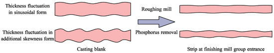 The billet produced by a continuous casting process is often used as raw material in the continuous rolling process. Due to the role of the vibrating crystallizer in continuous casting, the thickness of the billet changes periodically. As shown in Figure 9, after rough rolling and phosphorus removal process in the hot rolling process, the thickness fluctuation amplitude is greatly reduced, usually less than 50 μm, but there is still a periodic change rule. Different forms of thickness fluctuations lead to different forms of vibration after entering the finishing rolling group. Under ideal conditions, the thickness fluctuation patterns of the sinusoidal and additional skewness are taken as an example, and the vibration during the rolling process is studied with the above coupling model in Section 3.2.