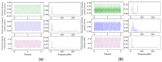 The vibration between the roll gaps directly affects the thickness deviation of the strip, which is the most important Therefore, the vertical vibration velocity , horizontal vibration velocity and torsional vibration angular velocity of the work roll are taken as indicators to analyze the vibration state of the rolling mill, corresponding to the first, second and third rows in Figure 10, respectively. It is assumed that the inlet thickness fluctuation frequency is 10 Hz and the amplitude is 0.02 mm. The calculation results are shown in Figure 10. After rolling, the vibration of the rolling mill is basically sinusoidal due to the sinusoidal thickness fluctuation, and the non-sinusoidal form of additional skewness fluctuation leads to rich harmonic components in the vibration of the rolling mill. The 60 Hz in vertical vibration spectrum, 20 Hz in horizontal vibration spectrum and 10 Hz in torsional vibration spectrum are all significant. Obviously, the latter form of thickness fluctuation can easily stimulate the natural frequency of each system of the rolling mill.