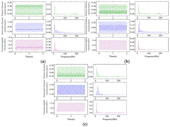 Vibration characteristics of rolling mill under different roll system offset angles: (a) αoff = 0.005 rad; (b) αoff = 0.01 rad; (c) αoff = 0.015 rad.