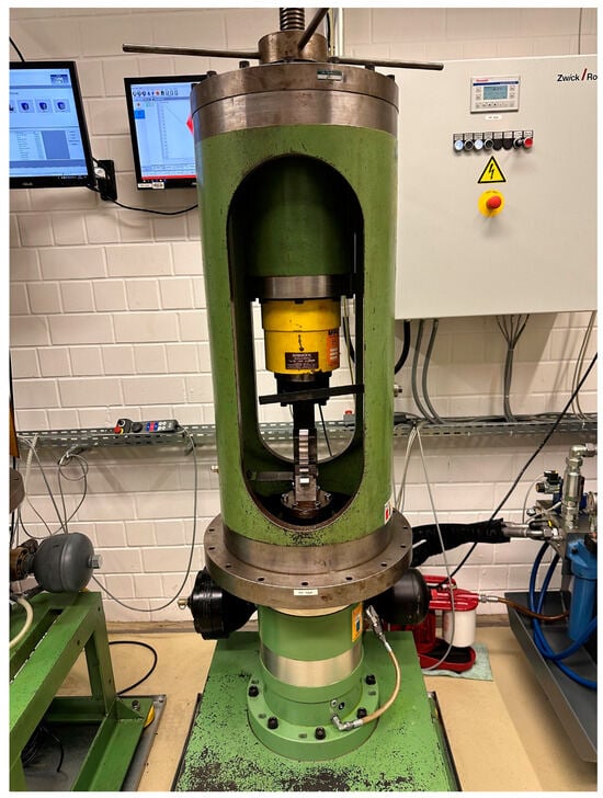 This paper uses data derived from tooth root breakage tests of spur gears. The tests are a continuation of the results presented by the authors in [26]. The data on the gears used are presented in Table 1. The gear geometry was developed at FZG, especially for the application as test gear regarding the tooth root carrying capacity at a pulsator test rig, and was used before in serval research projects at FZG [27,28]. The pulsator used for the experiments is shown in Figure 3, and a detailed description of this test rig is presented in [27,29]. The data generated using a pulsator test rig cannot be directly applied to the real operating conditions of gears; instead, an additional conversion has to be conducted. This is due to differences regarding loading conditions and statistics. Additional information on this topic can be found in [30]. This does not affect the validity of the results presented in this paper. All compared data and results originate from the same experimental setup, and therefore, a direct application of the test data is possible.