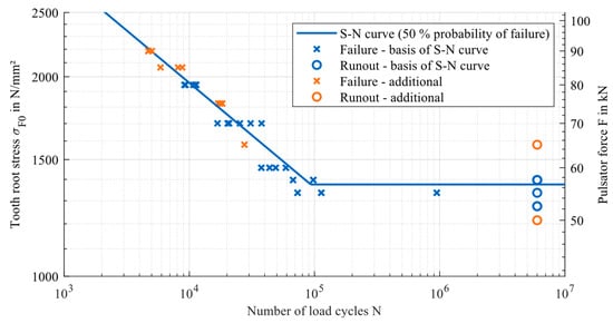 The results of the tests are presented in Figure 4, together with the resulting S/N curve. The endurance limit is determined using the staircase procedure, according to Hück [12]. The sloped section of the S/N curve is based on the results of the test using the load levels corresponding to 70 and 80 kN of pulsator force, respectively. All data points marked in blue are included in the determination of the S/N curve. To create an advanced database, additional test runs were conducted. These test runs would not have been required to determine the S/N curve but are used as an extended basis for the new approaches presented in this paper. The results of the additional runs are marked in orange and are not included in the presented S/N curve.