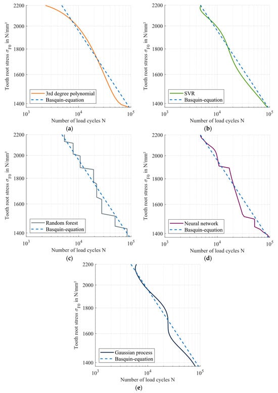 Since the publication of this approach back in 1910, the possibilities for data analysis have changed fundamentally. In particular, the advent of computers opened up new potential. In addition, recent developments in the field of machine learning have created new options for analyzing and describing data. In many fields of engineering, the application of machine learning enabled significant advancements, for example, in the field of condition monitoring [5,6,7]. The scope of this paper is to evaluate these methods for the description of the load-carrying capacity of gears. More precisely, this paper investigates various alternatives for the description of the load-carrying capacity in the load range of finite service life. The main question of this study is whether it is possible to reduce the scattering of the calculation results for the service life of gears under variable loads by applying one of the developed approaches compared to the results based on the approach, according to Basquin.