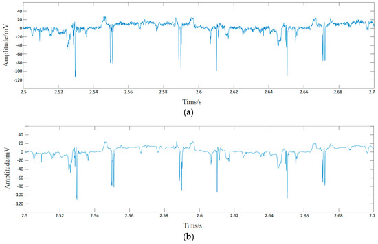 Figure 8a as an example, the calculated upper and lower threshold values are 5 and −5, respectively. The signal after removing the singular points is shown in