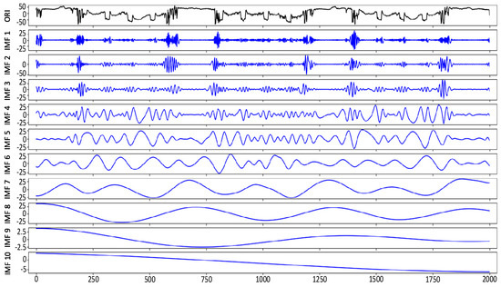Table 6, and the correlation coefficient threshold can be calculated as 0.178 according to Formula (9). Therefore, IMF 1, IMF 9, and IMF 10 were removed, and then the seven effective IMF components, IMF 2~IMF8, were used to compute three information entropies containing energy entropy, power spectrum entropy, and singularity spectrum entropy.