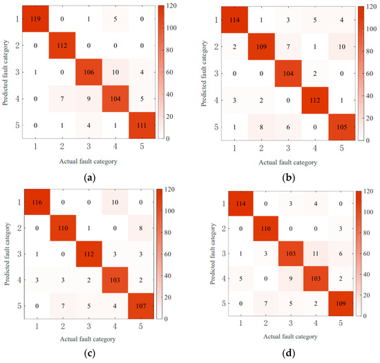 Table 8. It can be observed from the table that the overall diagnostic accuracy of the model is 90.96% after averaging the calculation results under four speed conditions, which can achieve better overall diagnostic performance. The individual diagnostic accuracies from Category 1 to Category 5 are 96.46%, 91.88%, 88.54%, 87.92%, and 90%, respectively. It can be observed that the diagnostic accuracy of the model for Category 1 (normal) is the highest, and the diagnostic accuracy for Category 3 (bearing ball failure) and Category 4 (bearing outer ring failure) is lower.