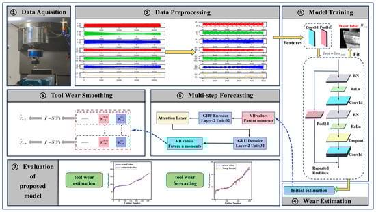 Figure 5. The sensor signals collected during machining and the corresponding tool wear values are put into the proposed model. Model training determines the optimal parameters of the proposed model. The initial estimates are transferred to a multi-step predictive time-series model. Through smoothing corrections, tool wear monitoring and prediction can be achieved.