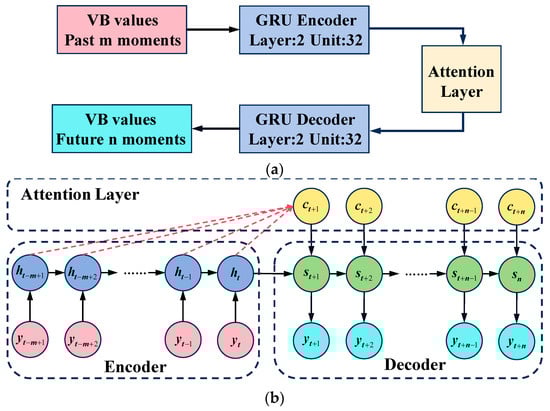 Figure 8a, adopts a GRU based encoder–decoder structure and applies the attention mechanism. The inputs of the encoder are the tool wear values of past moments, and the semantic vector is output by the encoder. The attention layer assigns a weight to the semantic vector at each respective moment, which is fed into the decoder as the initial hidden state, and then tool wear prediction of future moments is output, as shown in