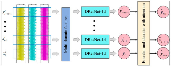 The integrated model for multi-step prediction of tool wear is used to construct an intrinsic link between multi-domain features of multi-channel signals and multi-step wear values. The continuous historical wear values obtained in the monitoring model are used as inputs to the time-series model and the information in the historical wear values is extracted by attention for the prediction of short-term and long-term wear values. The whole process can be expressed as Equation (8). The monitoring model reads the multichannel features