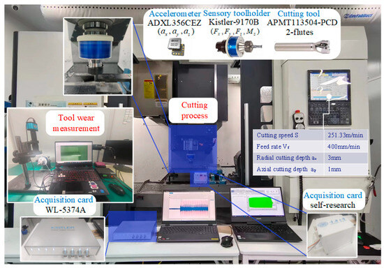 The proposed tool wear prediction method was applied to the machining of carbon fiber-reinforced polymer (CFRP) to test its generalization in a real machining environment. Side milling experiments were conducted on a three-axis vertical machining center (VMC855) in a dry cutting environment. The workpiece material was CFRP, the size was 450 mm × 40 mm × 11 mm, and the milling cutter was equipped with one APMT1135 PCD insert with a cutting diameter of 20 mm ( specific process parameters are shown in