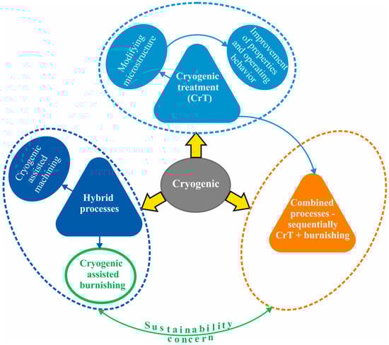 This review paper is dedicated to the portion of the hybrid processes in which static surface cold working under cryogenic or cool conditions occurs, i.e., CrA or cool-assisted (CoA) burnishing. This review considers the viewpoint of surface engineering [86], i.e., finishing–SI–operational behavior, with the aim of summarizing the effects of CrA and CoA burnishing on the SI characteristics and operational behavior of the investigated materials and proposing future research directions.