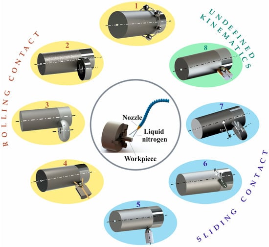 Schemes of cryogenic-assisted burnishing methods: 1—multiple ball burnishing; 2—roller burnishing with cylindrical roller; 3—roller burnishing with toroidal roller; 4—ball burnishing with hydrostatic sphere; 5—slide burnishing with spherical-ended insert; 6—slide burnishing with cylindrical-ended insert; 7—slide-roller burnishing; 8—ball burnishing with undefined ball motion.
