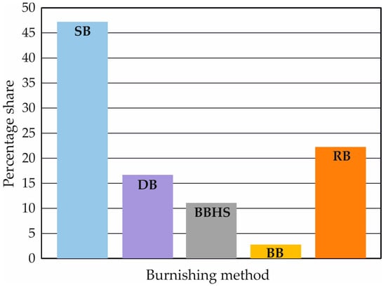 Percentage share of the used burnishing methods: SB—slide burnishing; DB—diamond burnishing; BBHS—ball burnishing with hydrostatic sphere; BB—ball burnishing; RB—roller burnishing.