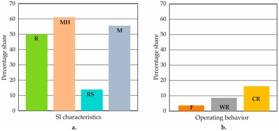 Percentage share of SI characteristics (a) and operating behavior (b): R—roughness; MH—microhardness; RS—residual stresses; M—microstructure; F—fatigue; WR—wear resistance; CR—corrosion resistance.