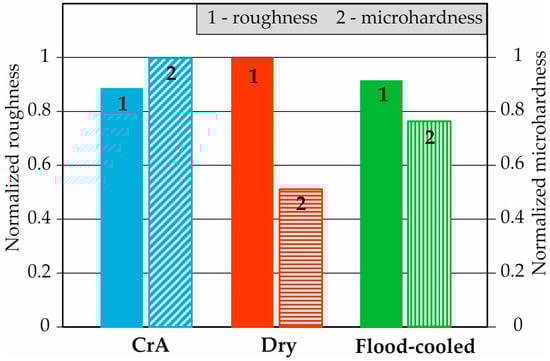 Starting from an initial roughness of μm (after turning), Caudill et al. [32] found that the CrA DR process achieved a smaller reduction (56.7%) of initial roughness than that achieved by dry (63.4%) and flood-cooled (58.2%) processes. All three processes are realized by means of the RB method using a 3.04 mm diameter tungsten carbide roller and four magnitudes of burnishing force. The influence of the burnishing force on roughness was found to be less than that of the burnishing conditions. Figure 7 summarizes the effects of CrA DR on the investigated characteristics of SI [32]. To compare the change trends of heterogeneous quantities, the Ra roughness parameter and the values of microhardness are normalized to unity, i.e., the maximum value of the corresponding quantity is taken as unity.