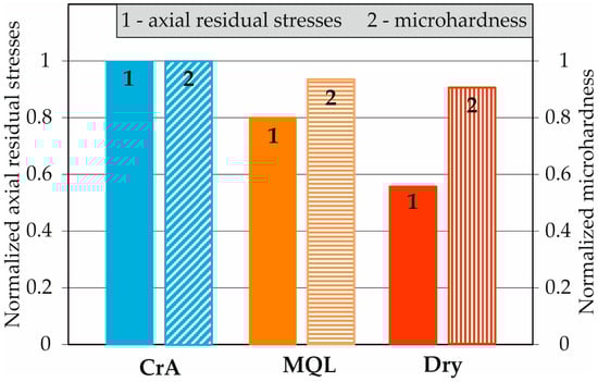 CrA DB was implemented by Sachin et al. [50,51,52,53,54,55] with the objective of improving the SI of this steel. Maximum surface microhardness values of 395 HV, 369 HV, and 357 HV corresponded to maximum surface residual stresses of −352 MPa, −282 Mpa, and −195 MPa, respectively, under cryogenic, MQL, and dry environment conditions [50]. Figure 9 shows the influence of DB conditions on surface axial residual stress and surface microhardness, normalized to unity. Both SI characteristics decrease with increasing heat generation, with the effect being more pronounced for residual stresses.