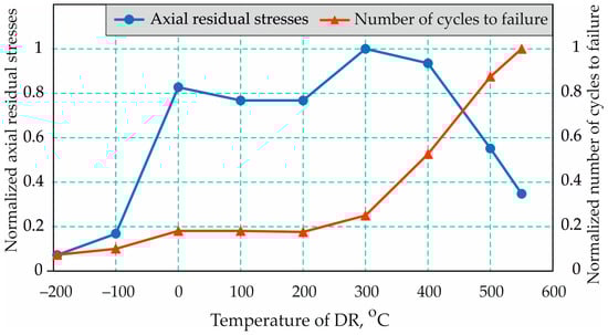 Nikitin et al. [41] studied the effects of the CrA DR process (using the BBHS method) on the fatigue behavior of specimens made of this steel and made a comparison with the effects of DR at temperatures between −192 °C and +800 °C. The rotary bending fatigue test was conducted at room temperature (25 °C), and the cycle parameters include the cycle asymmetry factor and a stress amplitude of 360 MPa. These authors have established that CrA DR led to the lowest number of cycles before fatigue failure. This was interpreted to be due to the large content of strain-induced α′-martensite in the surface and near-subsurface layers. The longest fatigue life (48,000 cycles) was shown by the samples heated under burnishing at 550 °C. The influence of the temperature during the DR process on the surface axial residual stresses and the corresponding number of cycles to failure in a normalized form to unity is shown in Figure 10, which clearly shows that the maximum surface compressive residual stress does not automatically lead to a maximum number of cycles to failure.