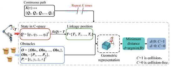 Traditional collision detection, as depicted in Figure 1, firstly maps joint positions Q to link positions T = {T1, …, Ti} by forward kinematics fk(∙), where i represents the link count. The links and obstacles are then represented using convex geometries such as capsules, spheres, and boxes. Obstacle information is described by the set O = {Obs1, Obs2, …, Obsj}, where each obstacle Obsj is characterized by the coordinates Pj and radius rj of m points. Subsequently, the distance d between these geometries is computed to determine the occurrence of collisions, which are classified as C. If d is not greater than 0, it is judged to be a collision, in which case C is defined as 1; otherwise, it is a non-collision state C = 0. For continuous path collision detection, the path X(τ) is discretized at a resolution K and detection is repeated for each sample point. This process is known as the exact collision detection method. Collision detection is transformed into the problem of computing the minimum distance between convex geometries.