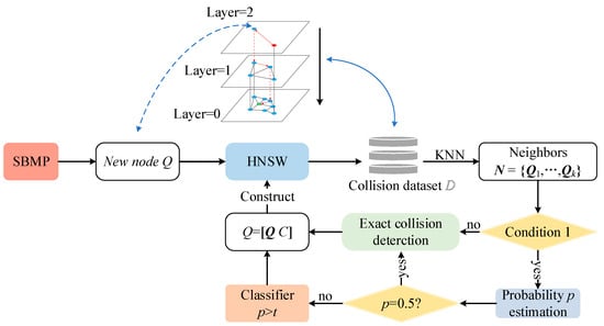 The KNN method, designed to identify the nearest neighbor information, has garnered significant attention across multiple domains, including databases [35,36], image processing [37], and deep learning-based control [38,39]. To reduce the complexity of the data search, practical implementations of KNN often employ approximate solutions. Among these, the graph-based KNN approach stands out as a prominent method for approximate querying [40]. The graph-based method constructs a neighborhood graph, where each data point corresponds to a node, the edges connecting the nodes define the neighborhood relationship, and the search speed is improved by the edges [41]. HNSW (hierarchical navigable small world) is a widely influential graph-based approximate KNN method [42]. HNSW is recognized as one of the most effective algorithms for querying speeds with fewer than 10,000 nearest neighbors and guarantees perfect recall [43]. KNN-based collision detection only needs to query a small number of nearest neighbors (less than 100) of the new node. Consequently, the HNSW algorithm is particularly well-suited to this task.
