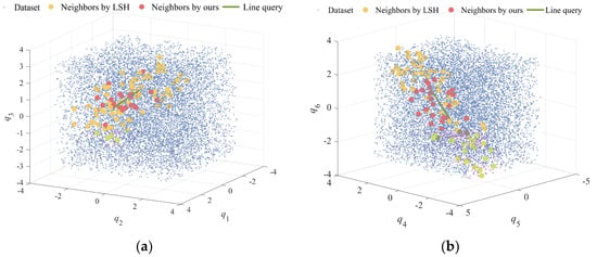 In the range [−π, π], 10,000 sets of 2D, 3D, and 6D nodes are randomly selected as the database to test the performance of the LSH method and the proposed method. Figure 4 illustrates the query results for the 2D and 3D databases, with red dots representing queries by the proposed method and yellow dots indicating those by the LSH method. The proposed method demonstrated a notable reduction in false positives, a trend consistent across the 6D database as well, as presented in Figure 5. This indicates the proposed method’s superior accuracy in filtering relevant data across multiple dimensions.