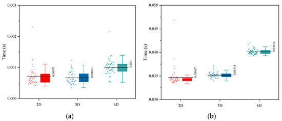 The proposed method exhibits superior efficiency in query times compared to the LSH method across datasets of varying dimensions. Specifically, the average query times for the proposed method are 7.1 × 10−4 s for 2D, 6.7 × 10−4 s for 3D, and 1.0 × 10−3 s for 6D datasets, as recorded in Figure 6a. In contrast, the LSH method shows average query times of 3.46 × 10−2, 3.52 × 10−2, and 4.01 × 10−2 s for 2D, 3D, and 6D datasets, respectively, as indicated in Figure 6b. Thus, the proposed method achieves a query time efficiency improvement by two orders of magnitude for 2D and 3D datasets and a 97.5% reduction for 6D datasets. These simulation results underscore the proposed method’s significant time-saving advantage over the LSH approach.