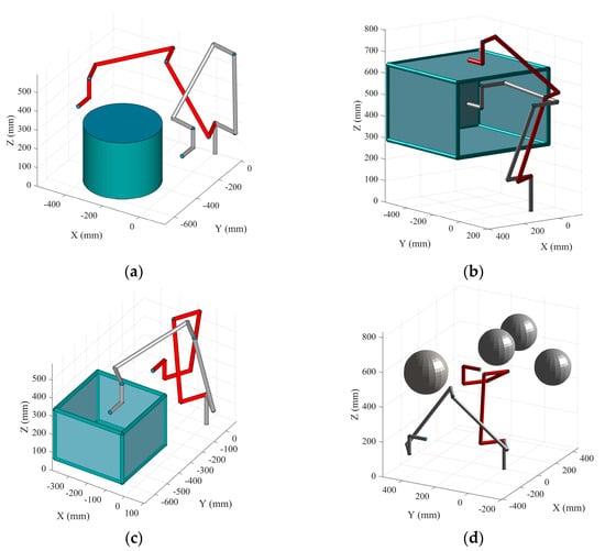 Four obstacle environments were simulated and designed, which were defined as cylinder scene, drawer scene, box scene, and sphere scene, respectively, as shown in Figure 8. The capsules are used to represent the linkage of the UR5 robot and obstacles are composed of spheres, capsules, and planes. The experiments were performed on an IntelⓇ CoreTM i7-9750H, @2.60GHz CPU.
