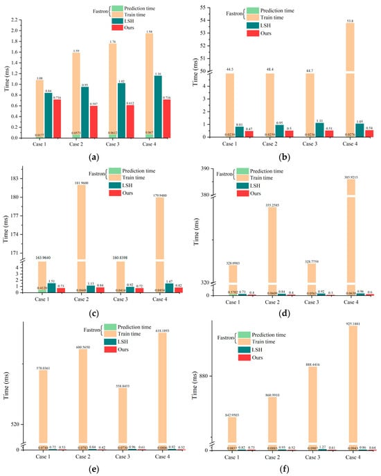 The comparative analysis presented in Figure 9a–f highlights the performance enhancements afforded by the proposed method over the LSH method across varying training set sizes. Specifically, with a training set size of 1000, the proposed method exhibited improvements in prediction speed by 14.8%, 37.2%, 40.0%, and 38.3% across the four simulated environments. Incremental increases in training set size to 5000; 10,000; 15,000; 20,000; and 25,000 further amplified the proposed method’s performance advantage, with respective speed enhancements of 23.0%, 47.4%, 54.1%, 48.6%; 51.7%, 25.7%, 13.7%, 44.2%; 18.2%, 36.4%, 58.7%, 33.5%; 26.4%, 34.0%, 32.5%, and 43.5% and finally, 10.8%, 44.1%, 52.0%, and 25.6%.