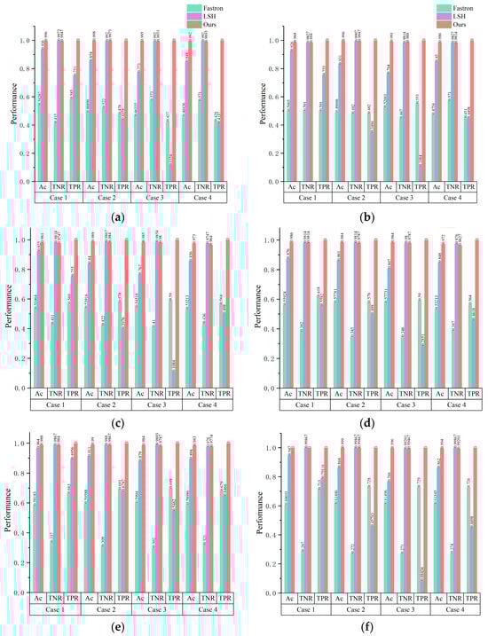 The Ac, TNR, and TPR performances of Fastron, LSH, and our methods on training sets of different sizes. (a) Size = 1000; (b) Size = 5000; (c) Size = 10,000; (d) Size = 15,000; (e) Size = 20,000; and (f) Size = 25,000.