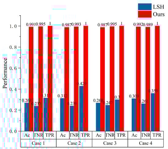 Ac, TNR, and TPR performance of the continuous paths of the LSH and our method in the four cases.
