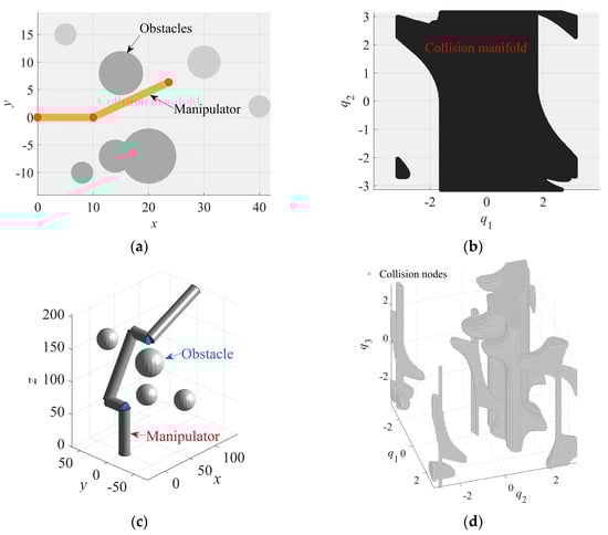 Obstacle environments and corresponding collision manifolds for the two manipulators. (a) Obstacle environment for a 2DOF manipulator; (b) Collision manifold for the 2DOF manipulator; (c) Obstacle environment for a 3DOF manipulator; and (d) Collision manifold for the 3DOF manipulator.