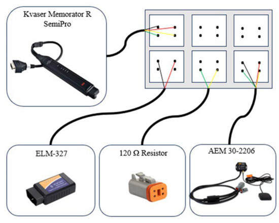 Data will be collected from the CAN communication network using a dedicated CAN protocol-based measurement system based on Kvaser Memorator R SemiPro CAN USB interface (Mölndal, Sweden); AEM 30-2206 VDM GPS and accelerometer sensor (Hawtrone, CA, USA); 120 Ω resistors (Palmdale, CA, USA); ELM-327 OBDII connector socket (London, ON, Canada).