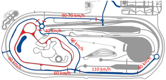 Figure 4 marked in blue), where different speed limits are in force due to different environmental elements, thus simulating real road traffic. On the Rural Road element of the test track, the maximum speed limits of each section have been pre-recorded and are linked to the track regulations and the current level of safety training, as shown in