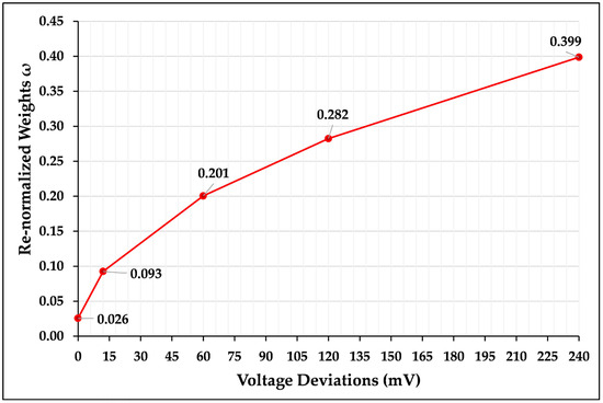 is the voltage deviation (in mV), and adding 1 (minimum value addition) ensures a weight value even for a 0 mV deviation. The calculation of weights based on this was as follows: