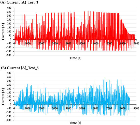 Figure 7, the current variations in Test 1 (red) have a wider amplitude and are more frequent, while in Test 5 (blue), current variations are less frequent and have a smaller amplitude.