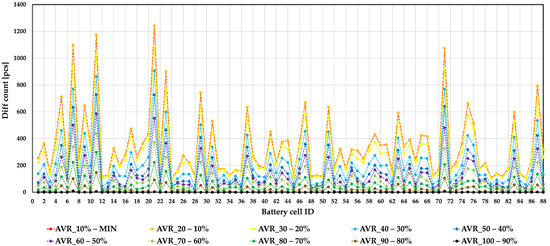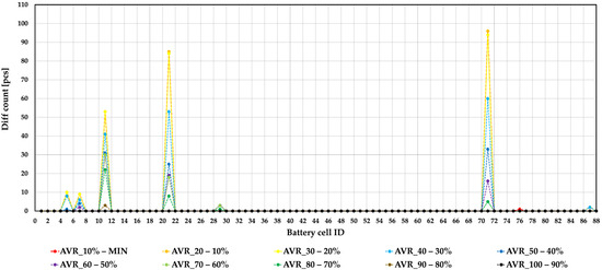 Figure 10 shows the cell identifiers (ID), and the vertical axis shows the deviation number. The first case under investigation deviates from the mean value of 0 mV. The cases in the figure refer to different SoC levels. Under_AVR_MIN indicates the number of deviations observed up to the fully discharged state. Under_AVR_10% shows the number of deviations up to the last 10%, and Under_AVR_20% is the sum of cases up to 20%. The values of each deviation are added continuously. Thus, the solid lines in
