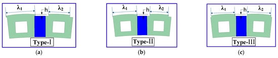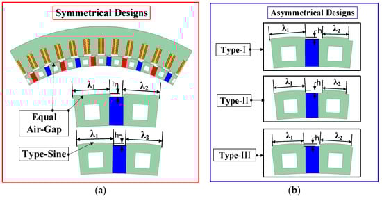 Figure 1b presents the asymmetrical design of the assisted-poles for the machine prototype. The symmetrical designs of the assisted-poles have an equal pole–arc ratio (λ1 = λ2), while the asymmetrical designs have an unequal pole–arc ratio (λ1 ≠ λ2). Three different types of asymmetrically designed assisted-pole structures are investigated for the analyzed spoke-type PMSM, as shown in Figure 1b. Table 1 presents detailed design parameters for the machine prototypes.