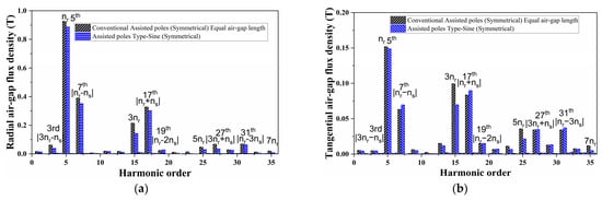 The distribution of air-gap flux density and the corresponding harmonic order analysis presented in Section 2 are applied to the symmetrically and asymmetrically designed cases of the assisted-poles for the machine prototype. The analysis is conducted considering the optimized values for the pole–arc ratio λ1 − λ2 = 0.18 for the asymmetrical designs of the assisted-pole types. Figure 8a,b presents a comparative analysis of the air-gap flux density (radial and tangential) harmonics for the analyzed machine designs.