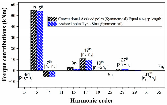The torque contributions from the respective air-gap flux density harmonic components for the analyzed machine designs are presented in Figure 3. It is evident from Figure 3 that the primary component contributing to torque is nr (5th), with additional significant contributions from modulated field harmonics, such as |nr − ns| (7th), 3nr (15th), and |nr + ns| (17th), along with other minor modulated harmonics. Moreover, the torque contribution originating from the primary order harmonic nr (5th) is relatively higher in the case of a conventional rotor design with equal air-gap length and symmetrical assisted-poles. The 7th harmonic order also contributes a negative torque proportion in both cases. Torque contributions from the modulated field harmonics are also obtained, as can be seen in Figure 3.