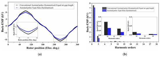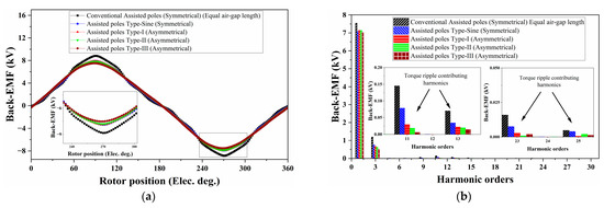 The back-EMFs for the analyzed machine design cases with symmetrical assisted-poles are given in Figure 4a, while a comparison of their FFT analysis is shown in Figure 4b. For the analyzed spoke-type PMSM, the torque ripples (first and second) order are generated by the harmonics in back-EMF, (11th and 13th) and (23rd and 25th), respectively. Figure 4b illustrates that the 11th and 13th back-EMF harmonics for the machine with symmetrically designed assisted-poles (Type-sine) are reduced by 46.20% and 51.42% in comparison to the machine having conventional (equal air-gap) length and symmetrically designed assisted-poles.