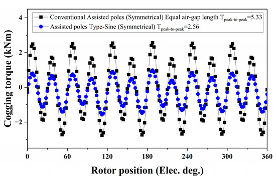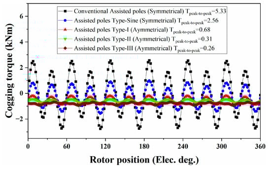The cogging torque for the machine designs with symmetrically designed assisted-poles is shown in Figure 5. The cogging torque (peak-to-peak) for the machine designs with symmetrical (Type-sine) assisted-poles is reduced in comparison to the conventional symmetrical assisted pole design of the machine prototype, as shown in Table 4.