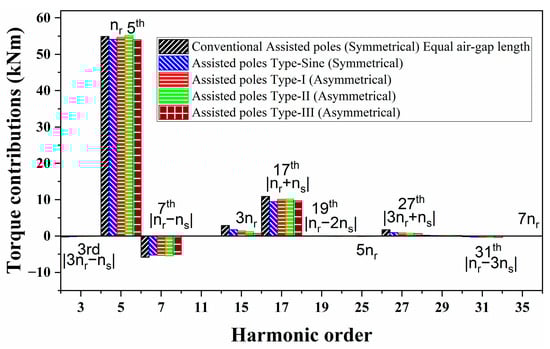It can be seen from the comparative analysis of the air-gap flux density harmonics for the symmetrical and asymmetrical assisted-poles designs of the machine prototype that, nr (5th) equal to the number of pole pairs is the main harmonic order, while there are considerable modulated field harmonics as can be seen in Figure 8a,b. The torque contributions from the corresponding air-gap flux density harmonics are presented in Figure 9 for the machine’s symmetrical and asymmetrical assisted-pole structures. Here also, it can be observed that (5th-order) harmonic is the main torque-contributing component for all the design cases, while the major torque-contributing modulated field harmonics include |nr − ns| (7th), 3nr (15th), and |nr + ns| (17th), besides other small contributing modulated harmonics.