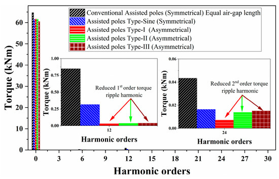 The FFT of the generated torque for the machine symmetrical assisted-poles design cases is shown in Figure 6b. The first and second-order torque ripple harmonics (h ± 1 = 12) and (h ± 1 = 24) are reduced for the symmetrical (Type-sine) assisted-poles design of the machine due to the suppression in the corresponding torque ripple producing harmonics validating the analytical investigation presented in Section 3.